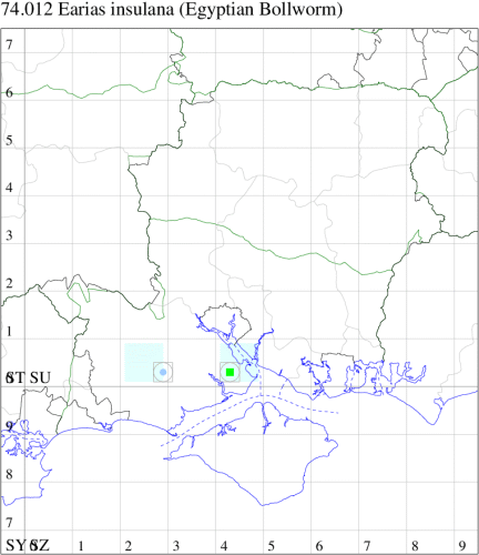 Spiny Bollworm Earias biplaga, which see for differences. Larva feeds on Cotton, causing sufficient damage to be a serious pest in some areas, no evidence of breeding in the UK.