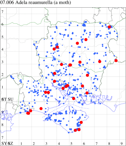 VC11: Ringwood, present, field obs., , 12 Jun (ASho); Linford, one, field obs., 15 May (IHayw); Lyndhurst, NF, present, field obs., , 01 Jun (SRC); Pignal Inclosure, NF, one, field obs., 25 May; Parkhill Inclosure, NF, 20, field obs., two leks, 25 May (SKee); Stockbridge, present, field obs., , 29 May (MFow); Sholing, Southampton, one, field obs., 28 May (PAB); Westend Copse, Southampton, 10, field obs., 01 Jun (LJoy); Wildern LNR, Hedge End, one, field obs., 11 Jun (TCrw); Crab Wood, Winchester, 12, field obs., 17 May; present, field obs., abundant, 05 Jun; present, field obs., 12 Jun (DAS); Boyatt Wood, Eastleigh, one, indoors, 15 Jun (SJon); The Moors NR, Bishop's Waltham, one, field obs., 13 Jun (DTru); The Holt, Bishop's Waltham, one, field obs., 31 May (PAB); Waterlooville, present, field obs., , 18 Jun (YEva); West Meon, one, field obs., 10 Jun (AMD); Lepe Point LNR, one, field obs., 24 May (PGS);