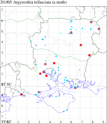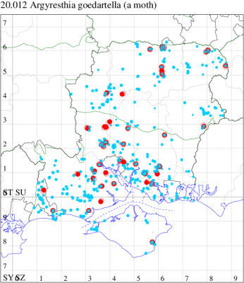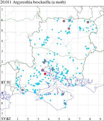 For the maps, all records prior to 2020 are shown by a blue dot (the larger the dot, the more recent), with the current year's records shown in red. As previous records are superimposed on any report for 2020, new sites have greater emphasis (i.e. will show as 'more red').