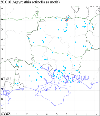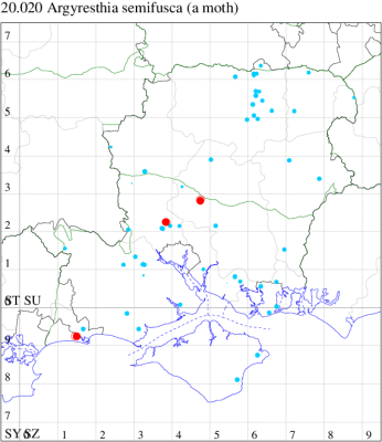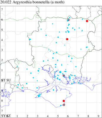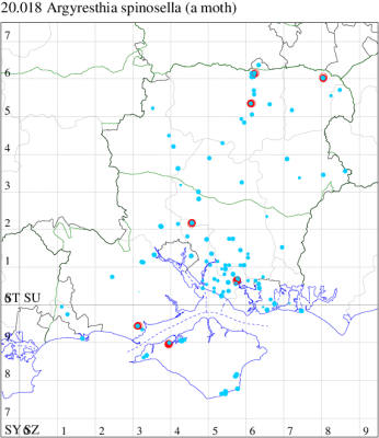 Common in hedgerows throughout much of the British Isles, except for the Highlands and Islands of Scotland. In Hampshire most frequent in the south-east of the county, with scattered records elsewhere and on the Isle of Wight. Wingspan 9-11 mm. The main confusion species are Apple Fruit Moth A. conjugella and A. semifusca, which see. Larva mines buds and shoots of Blackthorn, over-wintering as an egg.