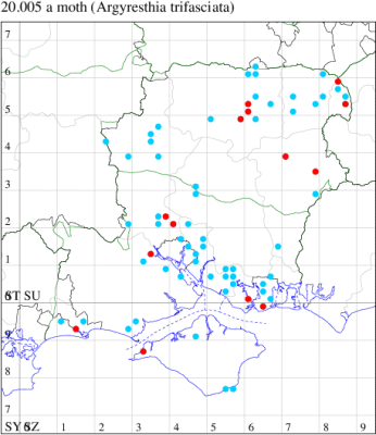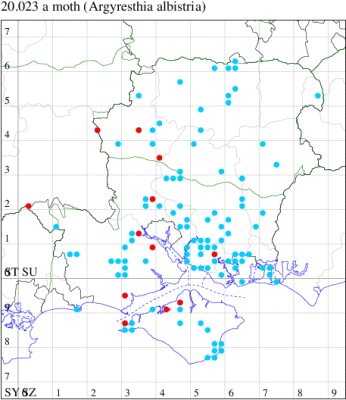 For the maps, all records prior to 2021 are shown by a blue dot (the larger the dot, the more recent), with the current year's records shown in red. As previous records are superimposed on any report for 2021, new sites have greater emphasis (i.e. will show as 'more red').
