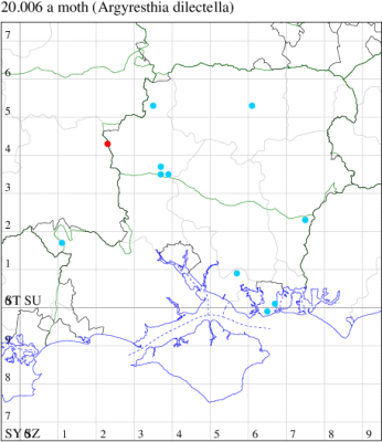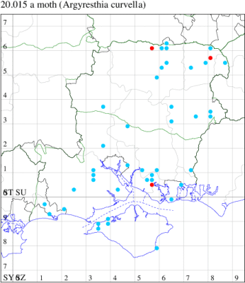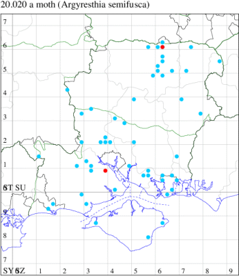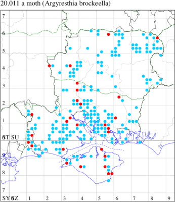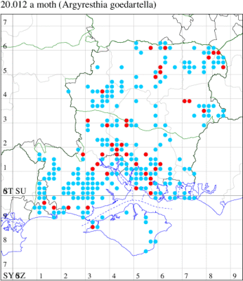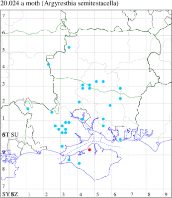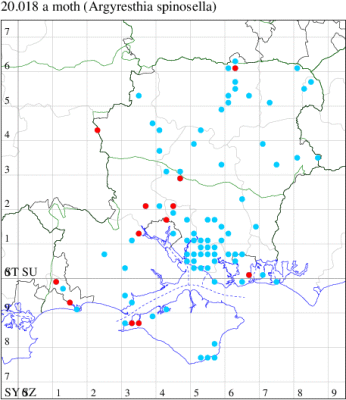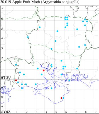 Common in hedgerows throughout much of the British Isles, except for the Highlands and Islands of Scotland. In Hampshire most frequent in the south-east of the county, with scattered records elsewhere and on the Isle of Wight. Wingspan 9-11 mm. The main confusion species are Apple Fruit Moth A. conjugella and A. semifusca, which see. Larva mines buds and shoots of Blackthorn, over-wintering as an egg.