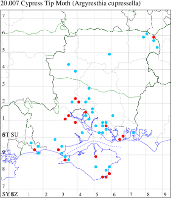 Local in gardens throughout much of Greater London and southern England, with records north to Lancashire. An adventive species, naturalised through accidental introduction in conifers from mainland Europe, now fully naturalised. In Hampshire first recorded in the county in 1998 in the north-east, from where it now appears to be spreading. Not recorded from the Isle of Wight to date. Wingspan 8-9 mm. Larva mines leaves and shoots of Juniper, Leyland Cypress, Lawson's Cypress, and other cultivated conifers.