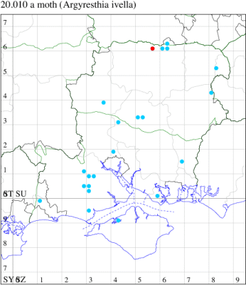 Nationally scarce (Nb) in downland, open woodland and gardens throughout much of the British Isles; rare in northern Britain and Ireland. In Hampshire recorded from amongst Juniper at Farley Mount and in the Stockbridge area, and also from gardens in Southsea and Basingstoke, where it could be associated with either Juniper or Cypress. Not recorded from the Isle of Wight to date. Wingspan 7-9 mm. Larva mines shoots of Juniper, Leyland Cypress and Lawson's Cypress.