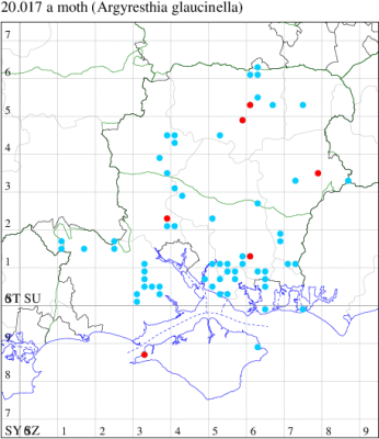 Local in open woodland, especially of oak, throughout Britain and southern Ireland. Fairly widespread in southern Hampshire and perhaps under-recorded in northern Hampshire and on the Isle of Wight. Wingspan 8-10 mm. The larval workings more easily found than the adult, which closely resembles A. spinosella, and which can often only be reliably separated by dissection of genitalia, although A. glaucinella is slightly smaller and has different habitat requirements. Larva mines bark of Oak.
