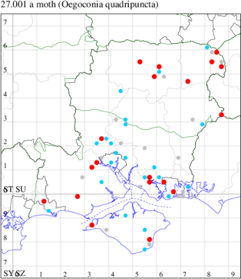 For the maps, all records prior to 2022 are shown by a blue dot (the larger the dot, the more recent), with the current year's records shown in red. As previous records are superimposed on any report for 2022, new sites have greater emphasis (i.e. will show as 'more red').