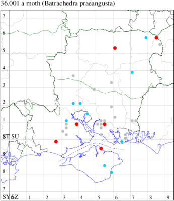 For the maps, all records prior to 2022 are shown by a blue dot (the larger the dot, the more recent), with the current year's records shown in red. As previous records are superimposed on any report for 2022, new sites have greater emphasis (i.e. will show as 'more red').