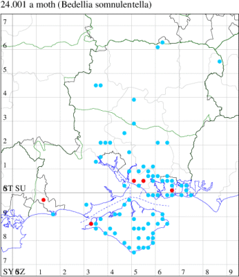 Local in hedgerows and on waste ground throughout much of southern Britain, where widespread but erratic in appearance, occurring with less frequency as far north as Co. Durham, the native populations periodically reinforced by immigration. In Hampshire and on the Isle of Wight almost exclusively confined to the coast in the south-east of the county and on the Island. Wingspan 8-10 mm. Larva mines leaves of Field Bindweed and Hedge Bindweed.