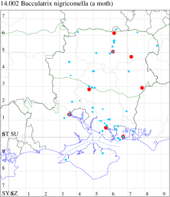 Local on embankments, waste ground and rough grassland throughout the British Isles. In Hampshire mainly confined to the coast, east of Southampton, very uncommon elsewhere. Recorded on the Isle of Wight for the first time at Freshwater in 2010. Wingspan 7-8 mm. Flies in the late afternoon and early morning. Distinguished from other Bucculatrix by dark metallic bronze ground colour, with diffused whitish spots on dorsum at one-half and three-quarters and two similar spots on costa slightly beyond, and white eye-caps (MBGBI Vol 2). Larva mines leaves of Ox-eye Daisy.
