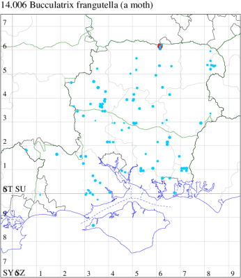 Local in fens, open woodland and hedgerows throughout much of south-eastern England, and in Yorkshire, Cumbria and on the Burren. In Hampshire it is found in boggy areas, where the foodplant is Alder Buckthorn, and on the chalk, where the larva is associated with Buckthorn. Not recorded from the Isle of Wight since 1975. Wingspan 7-8 mm. Larva mines leaves of Buckthorn and Alder Buckthorn, over-wintering as a pupa.
