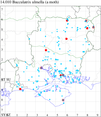 Local in hedgerows and woodland margins throughout much of southern England, with records north to Yorkshire. In Hampshire virtually restricted to the south-east, where it remains reasonably numerous around the three harbours, but very rarely recorded in north of the county and on the Isle of Wight; perhaps overlooked. Wingspan 8-9 mm. Larva mines leaves of English Elm and Small-leaved Elm, over-wintering as a pupa.