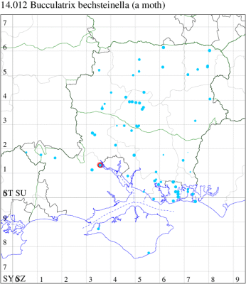 Local in scrub, hedgerows and woodland edges throughout much of England and southern Scotland. Widespread in Hampshire, although apparently absent from the New Forest in recent years, and only known from a handful of sites on the Isle of Wight. Wingspan 7-9 mm. Flies in evening sunshine. One of the less distinctive Bucculatrix species, and probably under-recorded. Larva mines leaves of Hawthorn, Pear, Apple, Rowan and Wild Service-tree, over-wintering as a pupa.