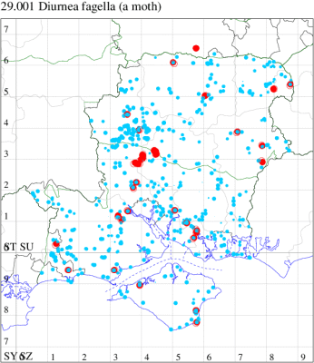 For the maps, all records prior to 2020 are shown by a blue dot (the larger the dot, the more recent), with the current year's records shown in red. As previous records are superimposed on any report for 2020, new sites have greater emphasis (i.e. will show as 'more red').
