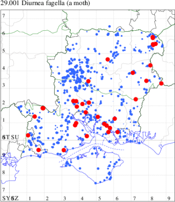 For the maps, all records prior to 2023 are shown by a blue dot (the larger the dot, the more recent), with the current year's records shown in red. As previous records are superimposed on any report for 2023, new sites have greater emphasis (i.e. will show as 'more red').