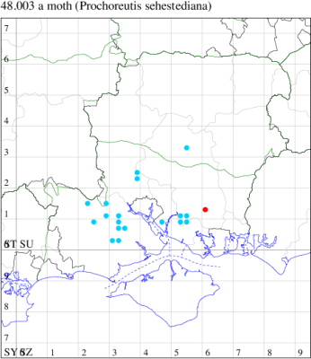 VC10: Headon Warren & Undercliff, three, field observation, 26 Jun (DCoo); Totland, two, field observation, 27 May; one, field observation, 01 Jun; one, 03 Sep (RTer); Farringford, 20, field observation, 25 May; Freshwater, 20, field observation, 09 Jun (DCoo); Afton Marsh, one, to pheromone lure, nUN Lure, 07 Jun (SDav); Brook Down, seven, field observation, 05 Jun; Newtown NNR, three, field observation, 23 Aug (DCoo); Ventnor Botanic Garden, one, field observation, 05 Jul (PBar); Holme Copse, Shanklin, three, field observation, 26 Jun (IOut);