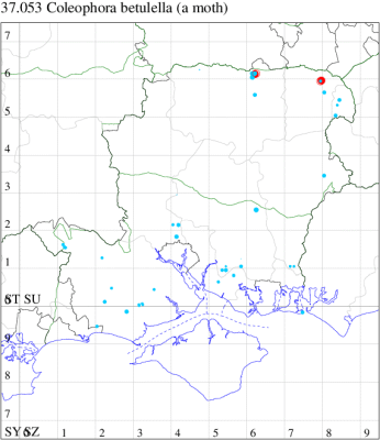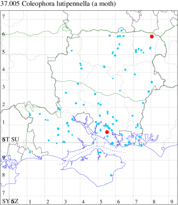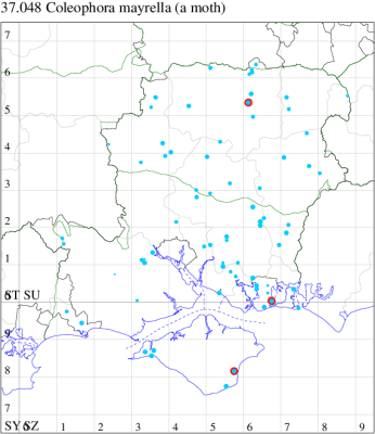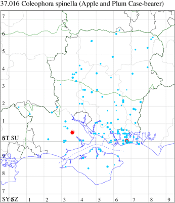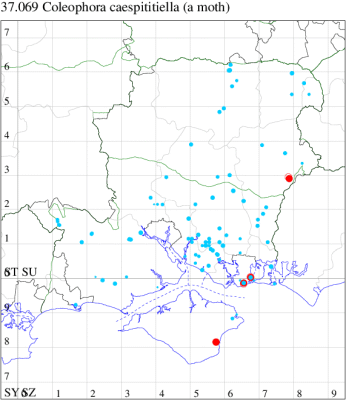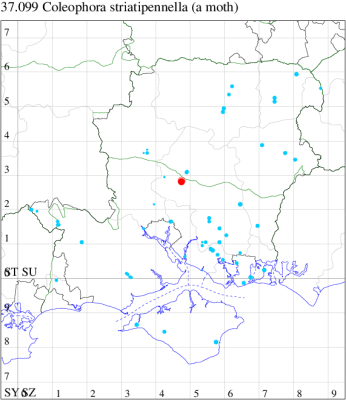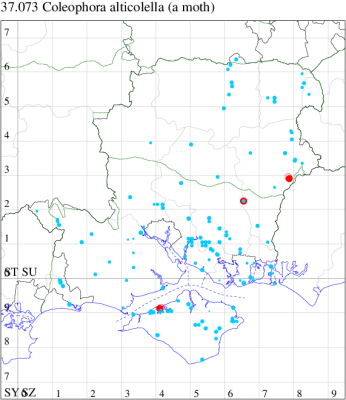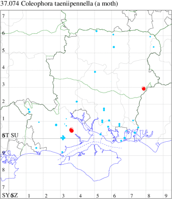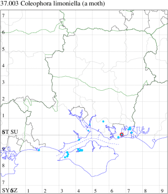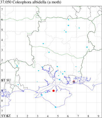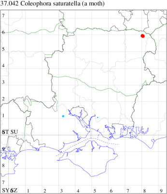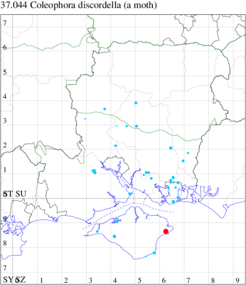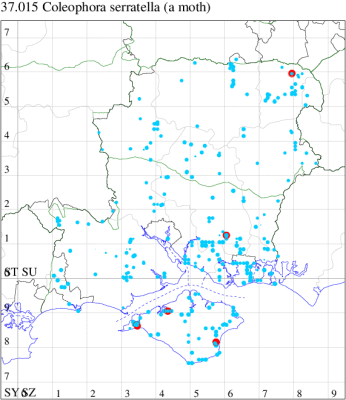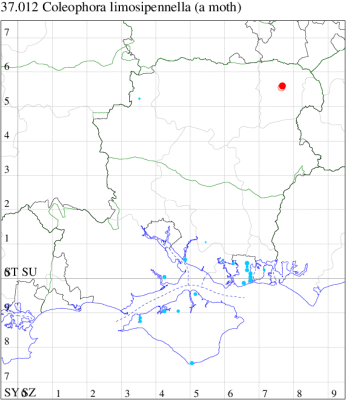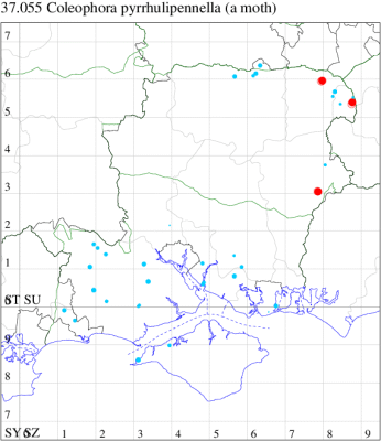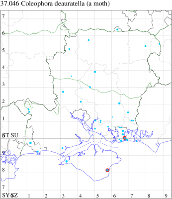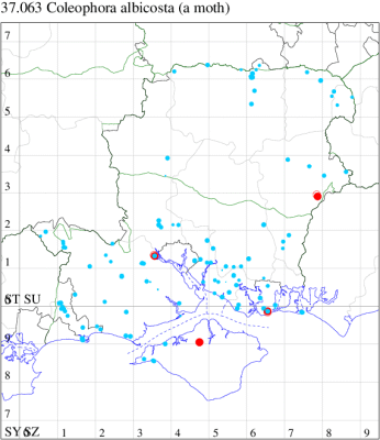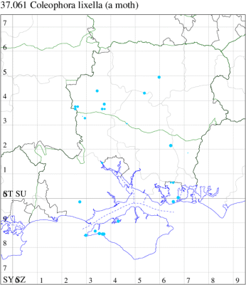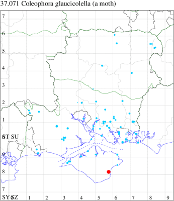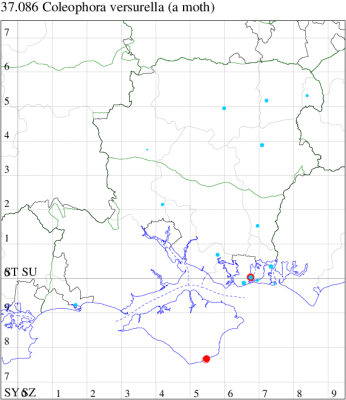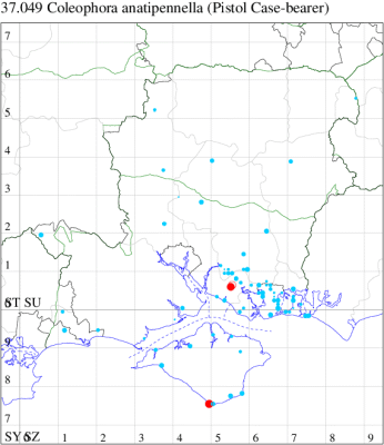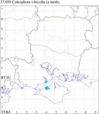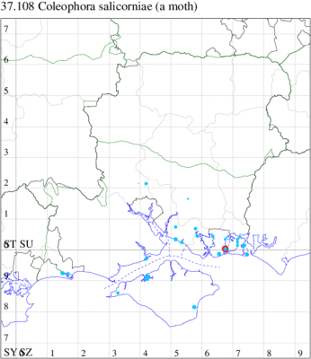 Nationally scarce (Nb) in saltmarshes along much of the coast of England, from Cornwall to Yorkshire, and in parts of Wales. In Hampshire and on the Isle of Wight restricted to coasts in the south-east of the county and north-west of the Island. Wingspan 12-14 mm. Like many of the Coleophora, imagines are virtually impossible to identify without recourse to dissection, and the larvae, which live in cases of characteristic form and which can sometimes be found on the foodplant, may be easier to identify by comparison against a reference collection. Larva feeds within seeds of Glasswort, living within a movable case, buried in mud.