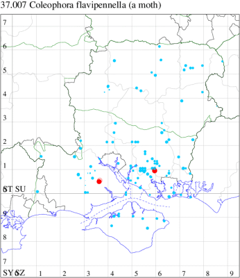 Vulnerable (proposed as a future Red Data Book species) in rough pastures and woodland rides, declining, and now probably restricted to Hampshire and adjoining counties, a priority species under the UK Biodiversity Action Plan. In Hampshire recorded recently from Beaulieu, Hayling Island, Stubbington and, most notably, Botley Wood; on the Isle of Wight recorded recently only from Newtown NR. Wingspan 17-22 mm. Almost always recorded in the larval stage, when the cases are fairly easy to find where they are present; the adult can only be separated from similar Coleophora by dissection of the genitalia. Larva mines leaves of Dyer's Greenweed, living within a movable case; case length 19 mm.