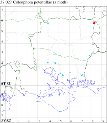 Local in rough grassland, damp woodland, fens, ditches and woodland rides in England, south of a line from Lincolnshire to Herefordshire, central and western Scotland, and western Ireland. In Hampshire and on the Isle of Wight there are scattered records throughout, but most frequent at Leckford, Botley Wood, Teg Down and Emer Bog. Wingspan 8-9.5 mm. Like many of the Coleophora, imagines are virtually impossible to identify without recourse to dissection, and best identified in the field, where in Hampshire the larvae are mainly found on rosaceous herbs and shrubs. Foodplants are wide ranging, quoted as including Agrimonia (Agrimony), Filpendula ulmaria (Meadowsweet), Fragaria vesca (Wild Strawberry), Geum spp (Avens), Potentilla spp. (Cinquefoils), Rosa spp. (Rose), Rubus sp (brambles). and also Crataegus (Hawthorn), Betula (Birch), Prunus spinosa (Blackthorn) and Helianthemum (Rock Rose). The case resembles that of C.violacea, but does not lie so flat again the leaf as this species (having a mouth angle of 30 to 50°). C.violacea also has a case which bulges in the middle, whereas in C.potentillae the case tapers towards the posterior.