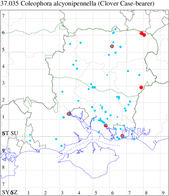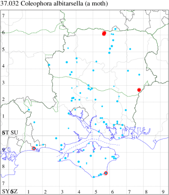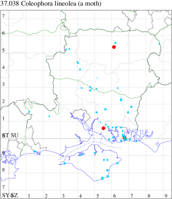 Common in rough grassland, downland and woodland clearings and in marshes and other damp places throughout much of the British Isles, except the Shetland Islands. In Hampshire and on the Isle of Wight rather infrequently recorded, with the usual concentration of records in the south-east of the county, probably under-recorded elsewhere. Wingspan 11-12.5 mm. Like many of the Coleophora, imagines are virtually impossible to identify without recourse to dissection, and the larvae, which live in cases of characteristic form and which can sometimes be found on the foodplant, may be easier to identify by comparison against a reference collection. Larva mines leaves of Common Bird's-foot Trefoil and Greater Bird's-foot Trefoil, living within a movable case.