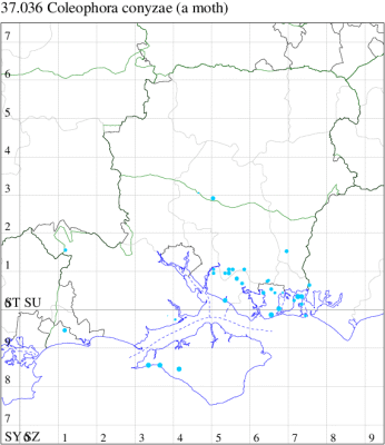 Nationally scarce (Nb) in chalk downland and freshwater margins in parts of southern England and southern Wales. In Hampshire mainly confined to the south-east, with just a handful of records in the north of the county and on the Isle of Wight. Wingspan 12-16 mm. Like many of the Coleophora, imagines are virtually impossible to identify without recourse to dissection, and the larvae, which live in cases of characteristic form and which can sometimes be found on the foodplant, may be easier to identify by comparison against a reference collection. Larva mines leaves of Ploughman's-spikenard and Common Fleabane, living within a movable case.
