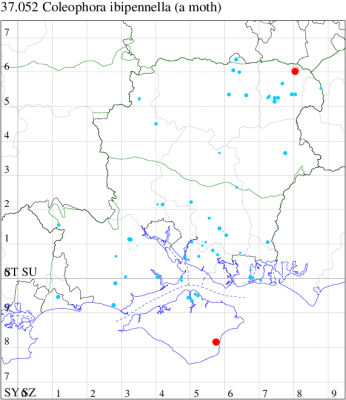 Nationally scarce (Nb) in bare muddy places and sand-dunes in the south-western counties of England and Ireland, and the Channel Island. In Hampshire mainly restricted to the south-east corner of the county, with a few records from bogs in the New Forest (with the first VC12 record in 2024); on the Isle of Wight, recorded at Yarmouth in 1992, but not subsequently. Wingspan 10-12 mm. Like many of the Coleophora, imagines are virtually impossible to identify without recourse to dissection, and the larvae, which live in cases of characteristic form and which can sometimes be found on the foodplant, may be easier to identify by comparison against a reference collection. Larva feeds within seed capsules of Toad Rush, living within a movable case.