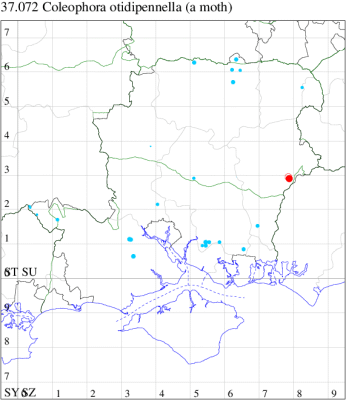 Nationally scarce (Nb) in woodland, grassland, cliffs, sand-dunes and saltmarshes throughout much of the British Isles, reaching the Orkney Islands, but very rare or absent from the eastern and east Midland counties (MBGBI Vol 3). In Hampshire largely restricted to areas such as Parnholt Wood, Botley Wood and Havant Thicket, and rare on the coast; there have been a few recent records from the New Forest. Recorded on the Isle of Wight for the first time in over 50 years at Parkhurst Forest in 2010. Wingspan 10-13 mm. Like many of the Coleophora, imagines are virtually impossible to identify without recourse to dissection, and the larvae, which live in cases of characteristic form and which can sometimes be found on the foodplant, may be easier to identify by comparison against a reference collection. Larva feeds on seeds of Goldenrod and Sea Aster, living within a movable case. The case is similar to that C. asteris.