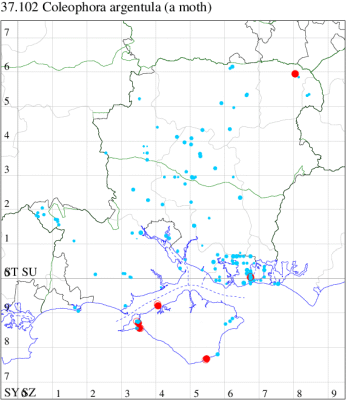 Nationally scarce (Nb) in saltmarshes throughout much of south-eastern England, with records north to Lincolnshire. Common in the salt-marshes of the Isle of Wight and southern Hampshire. Wingspan 10-11 mm. Imago fairly distinctive with its silver metallic markings; it comes readily to light and may be netted at dusk over its foodplant. Larva feeds within flowers and seedheads of Common Sea-lavender, living within a movable case, which can be quite easy to find amongst the foodplant.