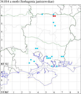 For the maps, all records prior to 2021 are shown by a blue dot (the larger the dot, the more recent), with the current year's records shown in red. As previous records are superimposed on any report for 2021, new sites have greater emphasis (i.e. will show as 'more red').