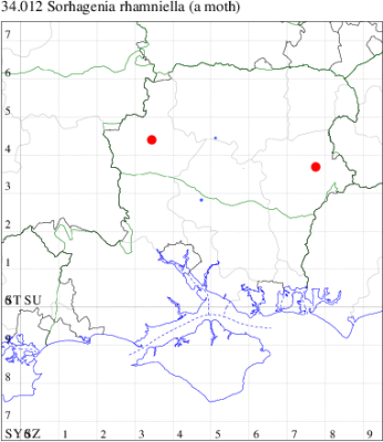 Nationally scarce (Na) in woodland margins on chalky soils and fens in parts of south-eastern England. In Hampshire the only confirmed records are from Winchester in 1991, Abbotstone Down in 1994 and Micheldever Spoil Heaps in 2006; however, it was found to be quite plentiful around buckthorn on Shortheath Common in July 2023. Not recorded from the Isle of Wight to date. Wingspan 8.5-10.5 mm. Can only be separated from S. lophyrella and S. janiszewskae by dissection of the genitalia. Larva feeds on buds, shoots and flowers of Alder Buckthorn and Buckthorn, living between flowers and leaves spun together with silk.
