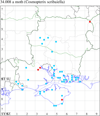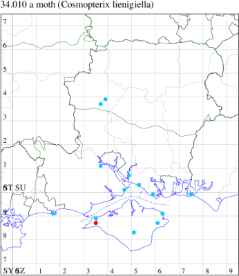 Nationally scarce (Nb) in reed-beds throughout south-eastern England. In Hampshire and on the Isle of Wight mainly confined to the coast and recorded inland in recent years only from the Leckford estate. Wingspan 10-13 mm. Similar to the other British Cosmopterix species, but yellowish brown, where the other species are black and orange. Larva mines leaves of Common Reed, over-wintering in a cocoon.