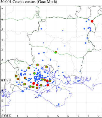 For the maps, all records prior to 2023 are shown by a blue dot (the larger the dot, the more recent), with the current year's records shown in red. As previous records are superimposed on any report for 2023, new sites have greater emphasis (i.e. will show as 'more red').