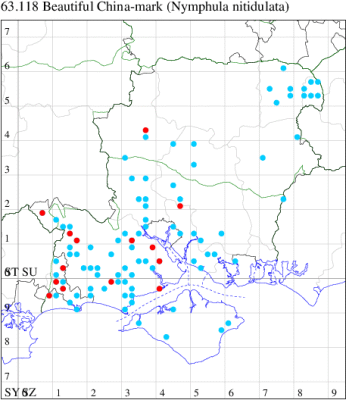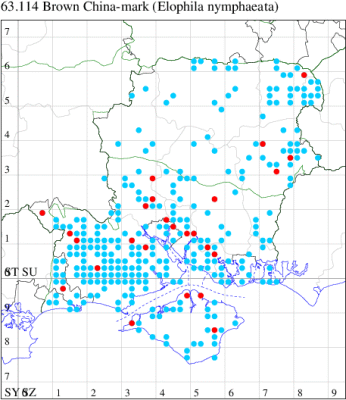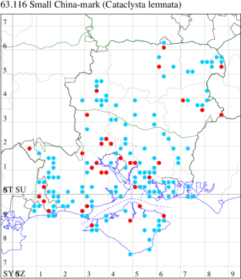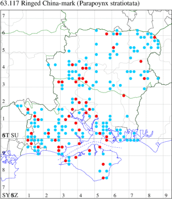 Local in ponds throughout much of Britain. In Hampshire widespread in the south, but in the northern half of the county, largely restricted to the north-east. Recorded on the Isle of Wight for the first time since 1952 at Freshwater in 2000. Wingspan 20-25 mm. Smaller and whiter than Brown China-mark Elophila nymphaeata; lightly marked specimens could be mistaken for male Ringed China-mark Parapoynx stratiotata, but in that species the forewing discal spot is a closed circle [Goater]. Larva feeds on Branched Bur-reed, Unbranched Bur-reed, Yellow Water-lily and other water plants, living entirely underwater.