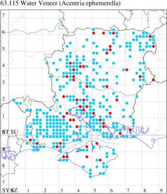 Common in ponds, lakes and slow rivers throughout much of the British Isles. In Hampshire and, to a lesser extent, on the Isle of Wight, locally abundant in suitable habitat throughout. Wingspan male 13-17 mm, female wingless. Only the distinctive male is likely to be encountered and on certain nights it undergoes massive dispersal flights when it appears at light far from water and often in vast numbers (1000+ not unknown). Larva feeds on Canadian Waterweed and Pondweed, living entirely underwater.