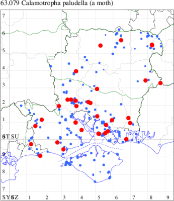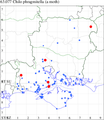 Local in reed-beds and fens throughout much of England and Wales. In Hampshire and on the Isle of Wight common in extensive reed-beds, mostly on the coast, and an occasional wanderer elsewhere, with only a few records from northern Hampshire, at Leckford, Fleet Pond and Old Basing. Wingspan male 24-32 mm, female 30-40 mm. Males are unmistakable; females could be confused with female Schoenobiinae, but in those species the costa is convex towards apex, whereas in C. phragmitella it is distinctly concave [Goater]. Larva feeds within stems of Common Reed and Reed Sweet-grass.