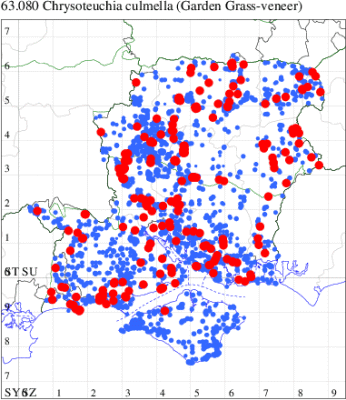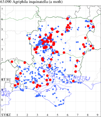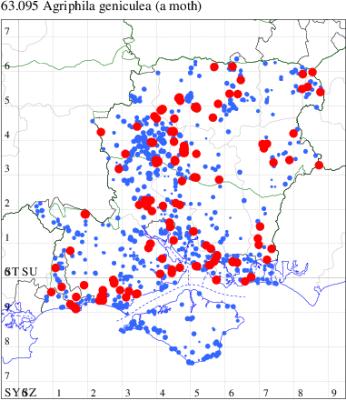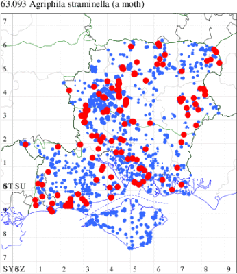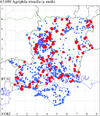For the maps, all records prior to 2023 are shown by a blue dot (the larger the dot, the more recent), with the current year's records shown in red. As previous records are superimposed on any report for 2023, new sites have greater emphasis (i.e. will show as 'more red').