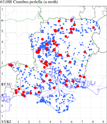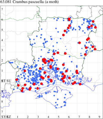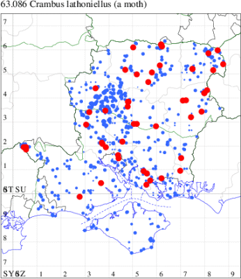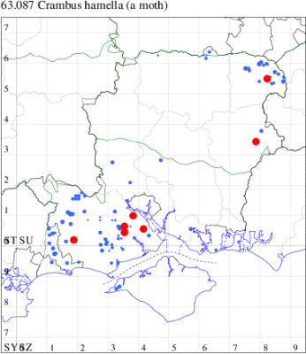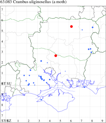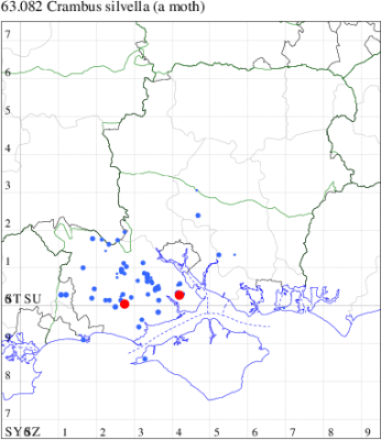 Nationally scarce (Nb) in bogs in parts of England and Wales. In Hampshire locally common in the wetter bogs of the New Forest, elsewhere appears to be resident in the Bordon area (vice-county 12). Very rare in the Isle of Wight, most recently in 2010. Wingspan 18-23 mm. Looks whiter than other Crambus in flight, and distinguished by broad white median longitudinal streak which touches costa to half-way [Goater]. Larva feeds on various grasses, living within a silken tube or tent.