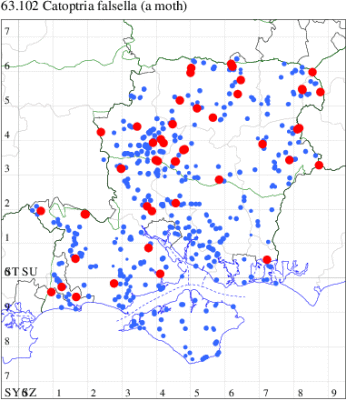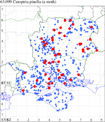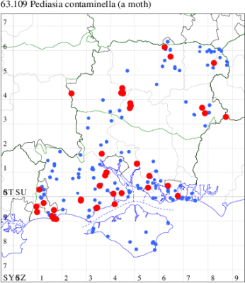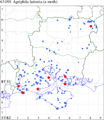 VC11: Brockwood, one, 10 Jul; three, 05 Aug; two, 11 Aug; one, 19 Aug; two, 15 Sep (SDut); Pig Bush, NF, one, 06 Jul (NRJ); Marchwood, four, 24 Jul; one, 29 Jul (TDCh); one, 18 Jun; one, 05 Jul; two, 27 Jul; one, 11 Jul; one, 02 Aug; Lee, two, 28 Jul (CTha); Needs Ore NNR, one, 23 Jul (CNB); Blackfield, one, 29 Jul (SJJ); Stubbington, one, 06 Sep (DPH); Funtley, one, 06 Sep (TDC); Botley, one, 13 Jul; one, 10 Aug; two, 11 Aug; one, 10 Sep; one, 11 Jul; one, 17 Aug; one, 19 Sep (SLB); Dean, Bishop's Waltham, present, 03 Sep (CMor); Horsea Island, six, 21 Jul; one, male gen det. , 04 Aug; three, 04 Aug (F.M.G.); Portsmouth, two, 23 Jun; one, 24 Jun; two, 07 Jul; one, 18 Jul; one, 27 Jul; two, 05 Sep; four, 06 Sep; one, 07 Sep; two, 08 Sep; one, 09 Sep; 23, 10 Sep; 34, 11 Sep; two, 17 Sep (IRT); Muscliffe*, one, 16 Aug; one, 06 Sep (KingB); Bournemouth*, one, 07 Jul (WSoa, SMorr); Hurn, two, 28 Jul; one, 29 Jul; two, 18 Aug; one, 19 Aug; Hengistbury Head, two, 16 Aug; Wick Fields, Hengistbury Head, one, 26 Sep; Hengistbury Head, one, 20 Jul; one, 23 Jul; three, 24 Jul; three, 31 Jul (MJef); Burton, nr Christchurch, one, 28 Jul; one, 31 Jul (JStw); Hengistbury Head, one, 23 Jul (MJef); Sway, one, 12 Aug; one, 05 Sep; one, 16 Sep (SKee); Sway, NF, present, 21 Jul (DMui); Lisle Court, Lymington, one, 09 Sep (AMus, JPMar det. JPM); present, field observation, 10 Sep (MPrnc); present, 09 Sep (AMus); Needs Ore NNR, two, 24 Jul; six, 09 Aug; three, 16 Aug (CNB);