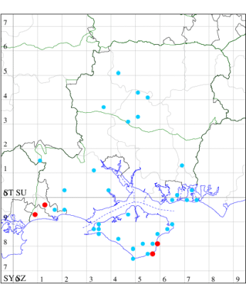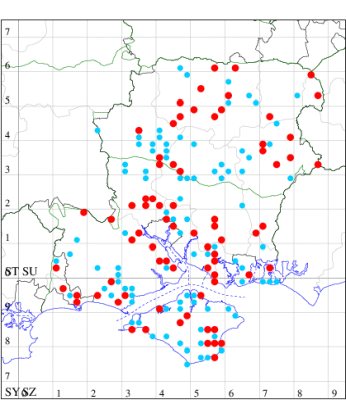 For the maps, all records prior to 2022 are shown by a blue dot (the larger the dot, the more recent), with the current year's records shown in red. As previous records are superimposed on any report for 2022, new sites have greater emphasis (i.e. will show as 'more red').
