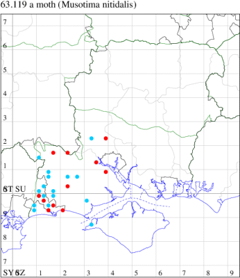 For the maps, all records prior to 2021 are shown by a blue dot (the larger the dot, the more recent), with the current year's records shown in red. As previous records are superimposed on any report for 2021, new sites have greater emphasis (i.e. will show as 'more red').