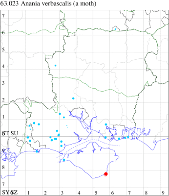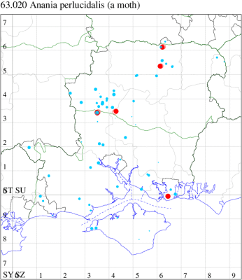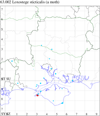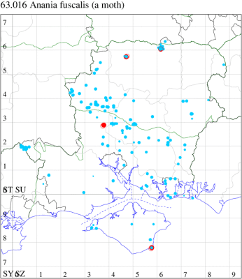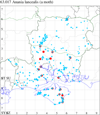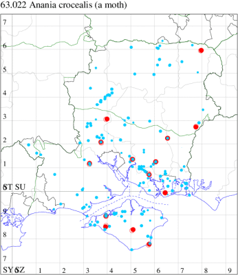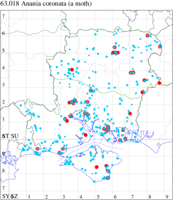 VC10: Tennyson Down, one, field observation, 05 Aug; West High Down Quarry, one, 07 Aug (IOu); Freshwater Bay, six, to actinic, 13 Sep; two, to actinic, 15 Sep (PBa); Cranmore, present, to actinic, 19 Aug (CHic); St Catherine's Point, one, field observation, 16 Aug; Windy Corner, one, 14 Sep (IOu); St Catherine's Down, one, field observation, 21 Sep (PBa); Mottistone Down, 12, 20 Jun (IOu); Bonchurch Revetment, one, field observation, 23 Apr (ABu); Bonchurch, one, 20 Jun; one, 22 Jun; three, 24 Jun; two, 12 Jul (JHa); Shanklin, one, 24 Jun; one, 01 Aug; one, 02 Aug; one, 23 Aug; Culver Down, one, 17 Jun (IOu);