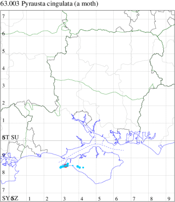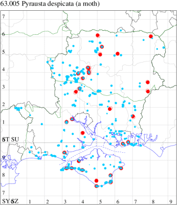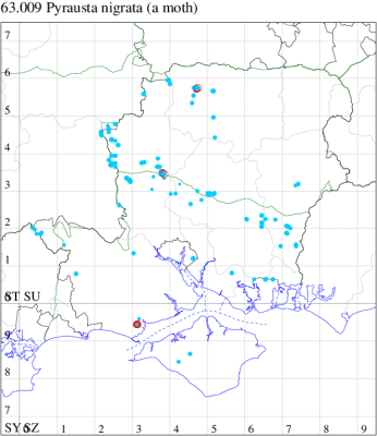 Local, on sand-dunes, dry heathland, downland and open areas on chalk or limestone, throughout the British Isles. Widespread in Hampshire and Wight. Wingspan 14-19mm. Forewing more mottled and less clearly marked than in any other British Pyrausta species [Goater]. Flies both by day and night. Larva feeds on Ribwort and Greater Plantain, forming silken galleries.