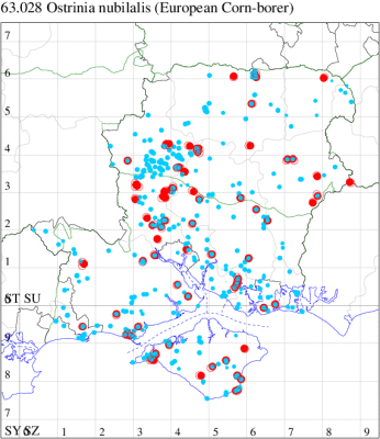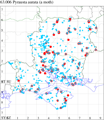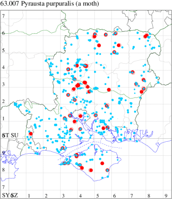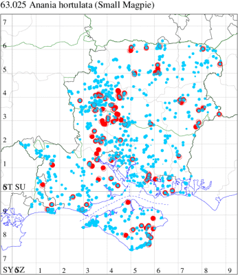 For the maps, all records prior to 2020 are shown by a blue dot (the larger the dot, the more recent), with the current year's records shown in red. As previous records are superimposed on any report for 2020, new sites have greater emphasis (i.e. will show as 'more red').