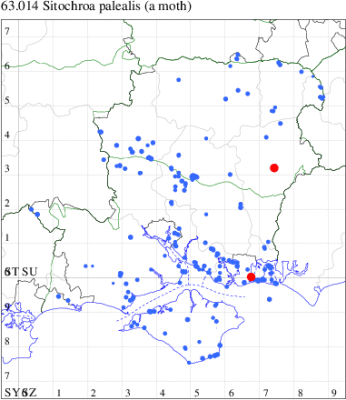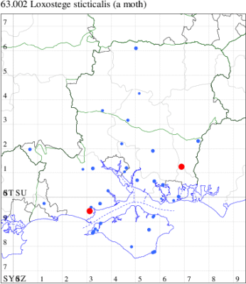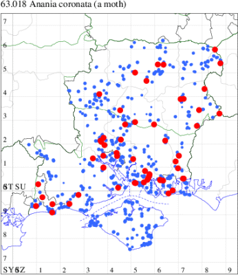 VC11: Brockwood, one, 01 Jul; one, 19 Aug (SDut); Broughton, one, 11 Jul (GCE); North Gate, NF, one, field observation, 18 Jun (TDCh); Lee, one, early record. , 28 May (CTha); North Baddesley, one, 17 Aug (RWPas); Broughton, one, 19 Jul (GCE); St Catherine's Hill NNR, Winchester, two, field observation, 27 Aug (GSD); Stubbington, one, 10 Aug (DPH); Fareham, one, 10 Aug; one, 20 Aug (ADT); Wickham, one, 02 Sep (JRDS); Portsdown, one, field observation, 22 May (RJD); Portchester, one, 05 May; three, 05 Jul; one, 11 Jul; one, 19 Aug (DH-J); Horsea Island, one, 12 May; one, 19 May; one, 21 Jul; one, 25 Aug (F.M.G.); Portsmouth, one, 04 May; one, 21 Jun; one, 22 Jun; one, 06 Jul; one, 07 Jul; one, 18 Jul; one, 21 Aug; one, 24 Aug; one, 04 Sep (IRT); Waterlooville, one, 01 Sep (DWhe); Beacon Hill nr Warnford, one, seen by day, 17 Apr (RJD); Old Winchester Hill, three, 28 Apr (F.M.G.); Havant Crematorium, one, 02 Sep (JGdr); Horndean, one, 23 Jun; one, 04 Aug (PHog); Hurn, one, 11 Jul; Hengistbury Head, two, 23 Aug (MJef); Barton on Sea, one, field observation, 24 Jun; Sway, one, 23 Aug (SKee); Needs Ore NNR, one, 09 Aug; three, 16 Aug (CNB); Warren Shore, North Solent NNR, two, field observation, 10 Aug; Needs Ore, one, field observation, 10 Aug (RAC); Browndown, one, 01 Sep; Browndown Coastal Ranges, one, 01 Sep (F.M.G.);