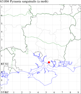 While a widespread but local species across much of the continent, in the UK populations are limited to a few colonies in sand-dunes and on limestone pavements in parts of western Ireland, northern Wales and the Isle of Man, and it is a priority species under the UK Biodiversity Action Plan. Therefore, one turning up at light in Stubbington in 2023 was probably one of the more surprising mothing events of the 21st Century, presumably relating to a primary migrant from the continent. Wingspan 14-18 mm. Somewhat variable in the brightness and contrast of the markings, but unlikely to be confused with any other British Pyrausta [Goater]. Larva feeds on Wild Thyme.