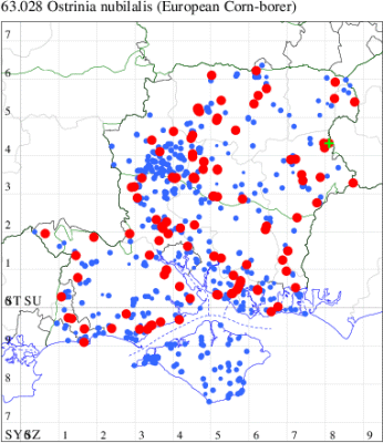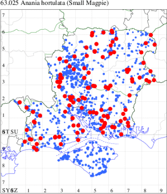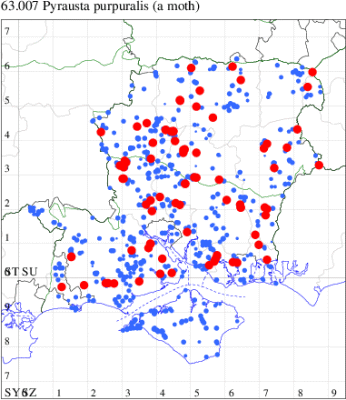 For the maps, all records prior to 2023 are shown by a blue dot (the larger the dot, the more recent), with the current year's records shown in red. As previous records are superimposed on any report for 2023, new sites have greater emphasis (i.e. will show as 'more red').