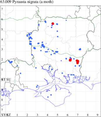 Local, on sand-dunes, dry heathland, downland and open areas on chalk or limestone, throughout the British Isles. Widespread in Hampshire and Wight. Wingspan 14-19mm. Forewing more mottled and less clearly marked than in any other British Pyrausta species [Goater]. Flies both by day and night. Larva feeds on Ribwort and Greater Plantain, forming silken galleries.