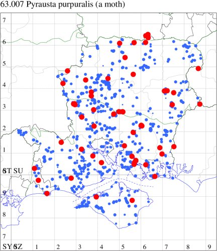 Local, on sand-dunes, dry heathland, downland and open areas on chalk or limestone, throughout the British Isles. Widespread in Hampshire and Wight. Wingspan 14-19mm. Forewing more mottled and less clearly marked than in any other British Pyrausta species [Goater]. Flies both by day and night. Larva feeds on Ribwort and Greater Plantain, forming silken galleries.