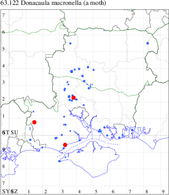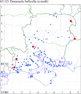 Nationally scarce (Nb) in marshes, river-banks and other damp areas throughout much of southern England, central Scotland and Ireland. In Hampshire local in fens and marshes, particularly in the Test valley. On the Isle of Wight, restricted to the extreme western corner. Wingspan male 22-26 mm, female 29-35 mm. The main confusion species is D. forficella, which see for differences. Larva feeds within stems of Common Reed, Reed Sweet-grass and Sedge.