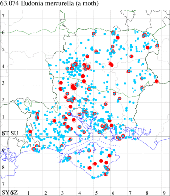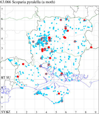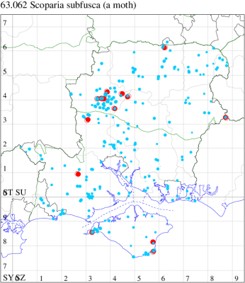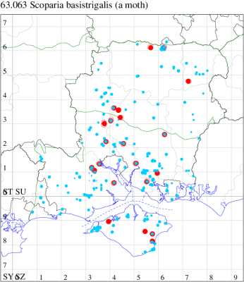 Historically associated with coastal sand-dunes and rough ground throughout the British Isles, this species in recent decades has been increasingly common inland. This picture is mirrored in Hampshire and on the Isle of Wight and it is generally regular to traps across the two counties, and is the only scopariid to be seen in winter. Wingspan 17-22 mm. Easily recognised by the narrow, pointed, brown-tinted forewing [Goater]. Larva feeds on various mosses, often on walls and sand dunes.