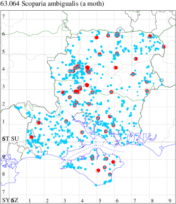 For the maps, all records prior to 2020 are shown by a blue dot (the larger the dot, the more recent), with the current year's records shown in red. As previous records are superimposed on any report for 2020, new sites have greater emphasis (i.e. will show as 'more red').